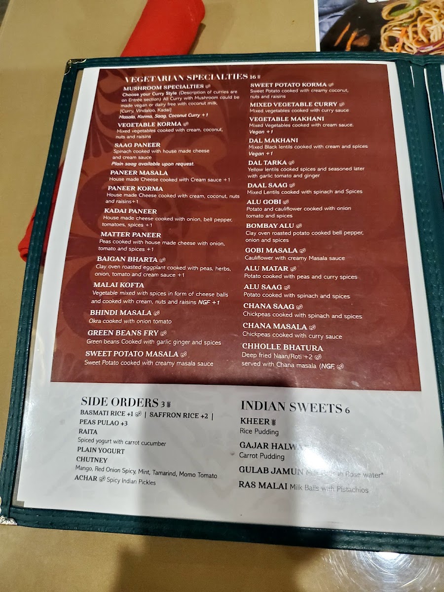 Veg samosa and veg pakora, saag paneer, veg korma, daal, sweet potato masala, naan, kheer, and basmati rice