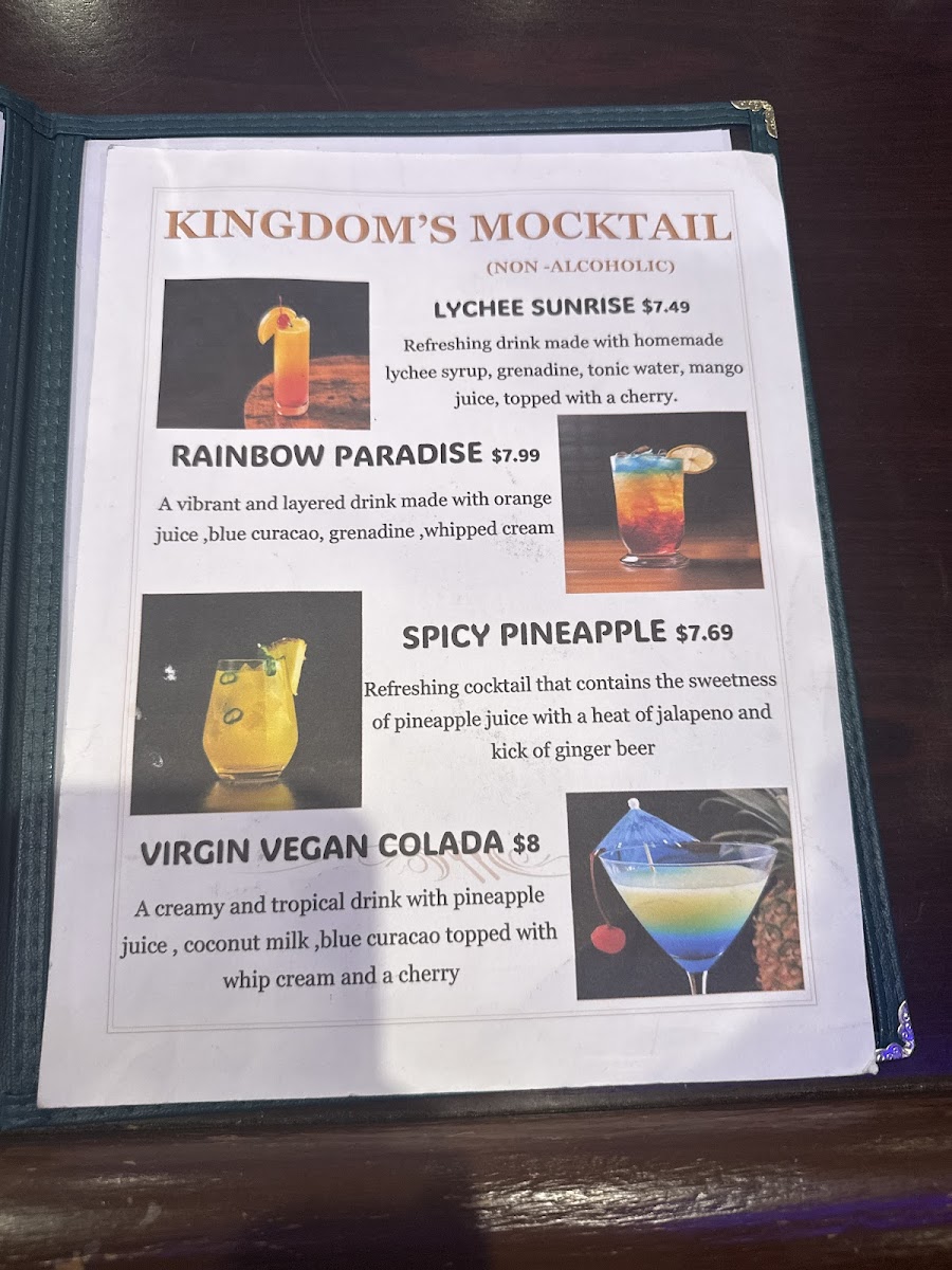Refreshing drink made with homemade lychee syrup, grenadine, tonic water, mango juice, topped with a cherry.