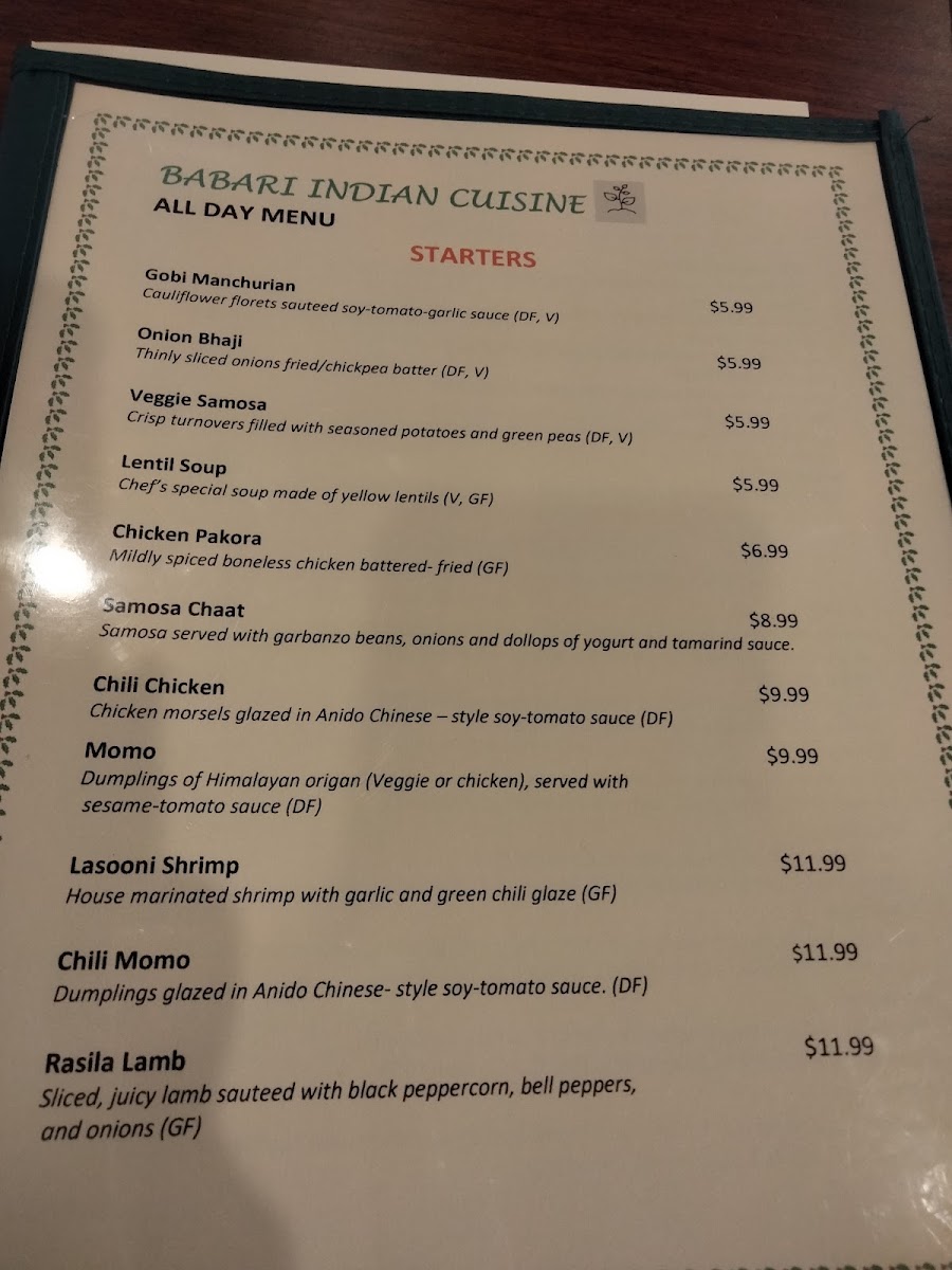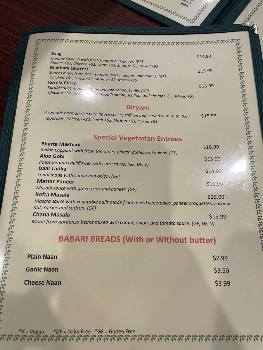 Veg pakora and chicken pakora, tandoori chicken, chicken tikka masala, saag paneer, veg korma, lamb curry, naan, kheer, and basmati